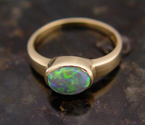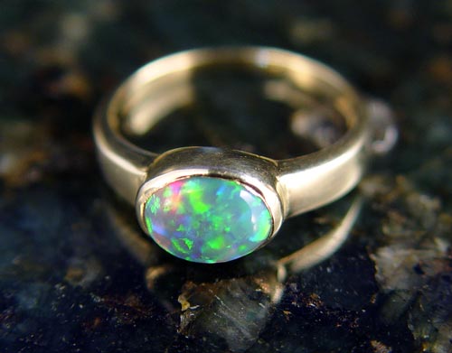 1 CT. SEMI-CRYSTAL OPAL RING: 14K yellow gold ring with one oval cabochon cut opal. Weight: Approx. 1.00 Ct. Body color: Gray. Play-of-color: Blue/Green. Brightness level: 3.5 Pattern: Harlequin. The opal is bezel set. Weight: 2.7 grams. Size: 7