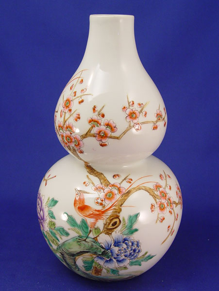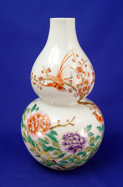 MID CENTURY CHINESE POLYCHROME DOUBLE GOURD VASE: 10'' tall & 6 1/2'' aprox. overall dia. 4 character under glaze stamp mark. Actual age unknown.