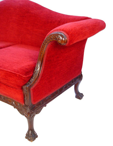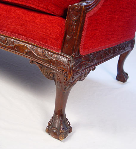 FINELY CARVED MAHOGANY FRAME CAMEL BACK SOFA: Early 20th century carved sofa. 5 ball and claw feet, later upholstery. Measures 86'' long x 25'' high x 30'' deep.