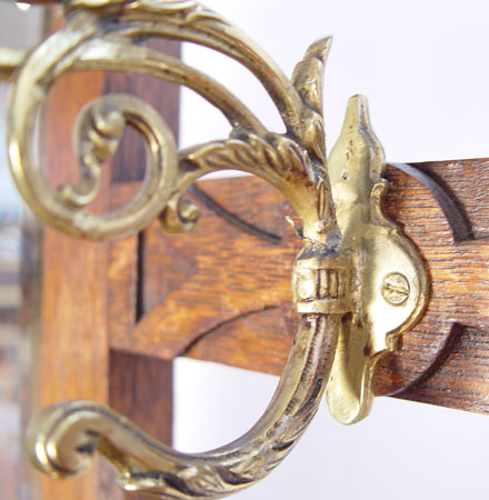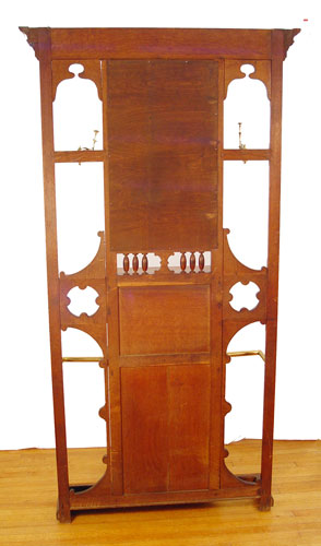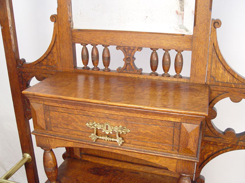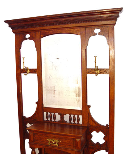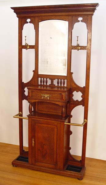 VICTORIAN GOLDEN OAK HALL TREE: Molded and carved cornice over arched and beveled mirror. Single drawer shelf over cabinet door. Brass rails frame the umbrella stands with insert intact. Please note mirror condition and repair to one brass hook. Measures 87'' high x 39'' wide x 10'' deep.