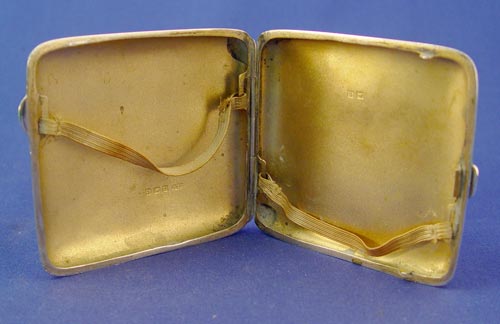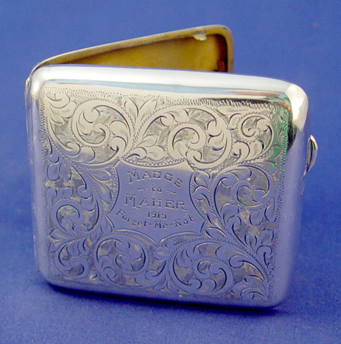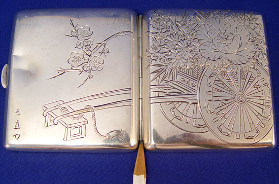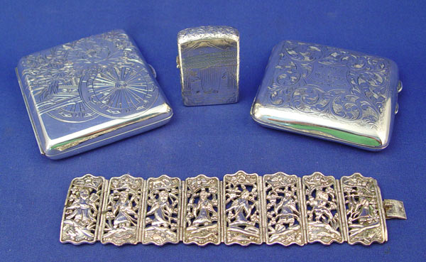 4 PIECE LOT STERLING CIGARETTE CASES, LIGHTER, BRACELET: To include 1) 1918 date F. D. Long Birmingham silversmith cigarette case. Inscribed dedication dated 1919. Measures 3 1/2'' x 3 1/4''. Approx. 3.7 troy oz. 2) Japanese .950 silver cigarette case signed in characters. Please note minor dings on back. Measures 3 3/4'' x 3 3/8''. approx. 4.4 troy oz. 3) .950 silver Zippo lighter with oriental designs. Marked Zippo Mfg Co. Bradford PA on inside works. 2 1/4'' x 1 1/2''. Approx. 1 troy oz. Note top does not close totally. 4) Link bracelet depicting figures, animals, floral motifs. Metal content unknown. Marked Made in China. 7 1/8'' long x 1 3/4'' wide.