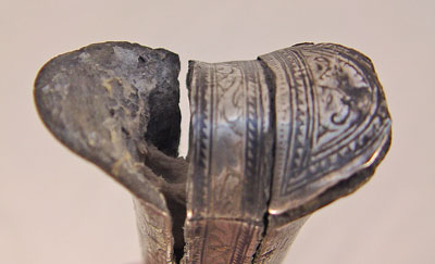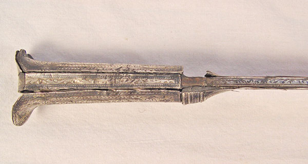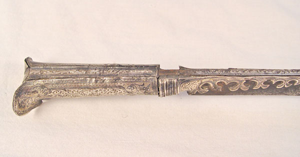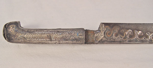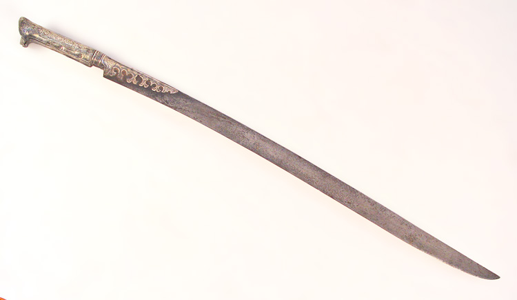 SILVER GRIP PERSIAN DAGGER / SWORD: Circa 19th century with ornate silver grip, silver decoration continuing onto blade. Slightly curved blade measures 25'' in length. Blade is marked with unidentified armourer's touchmark, scattered peppering and pitting. Please note condition of grip. No scabbard.