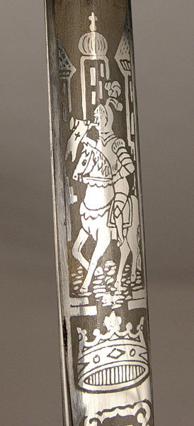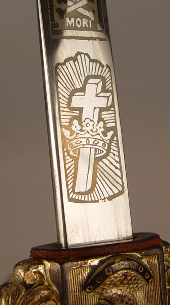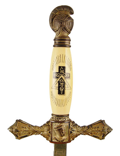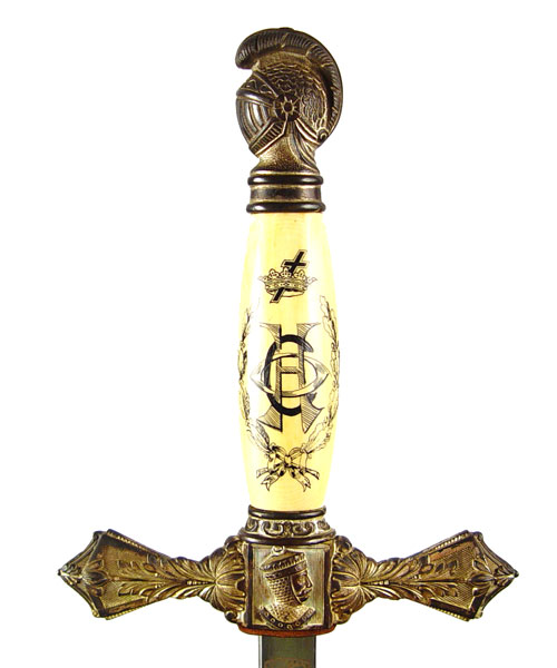 M.C. LILLEY MASONIC / KNIGHTS TEMPLAR SWORD: Early 1900's era with knighthead pommel, ornate cross guard and ivory appearance grip with Masonic decoration and owners initials. Ornate decorated blade with Masonic themes and owners name. Marked The M.C. Lilley & Co. Columbus Ohio. Blade measures 28'' in length. Scabbard has decorated mounts, top mount has enamel cross and crown. Isolated spots of missing finish.