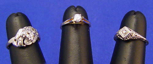 LOT OF 3 DIAMOND RINGS: Three 14K white and yellow gold diamond rings with round single cut, brilliant cut, old mine and irregular shaped rose cut diamonds. Largest is approx. .25 Ct. Smallest is approx. .01 Ct. The diamonds average VS-I1in clarity and H-I-J in color. Weight: 5.2 grams. Sizes 4.5 - 5.5