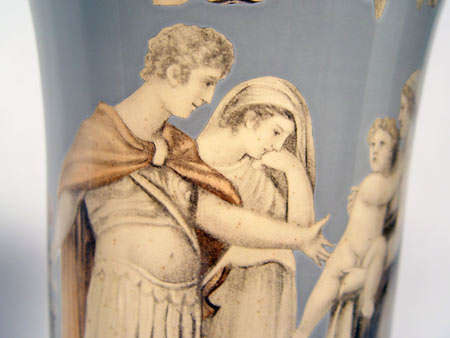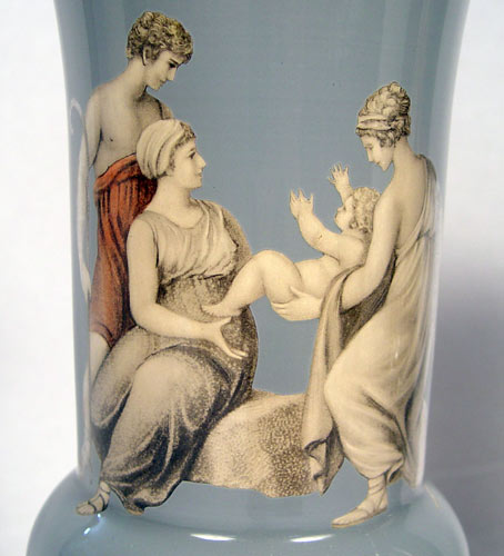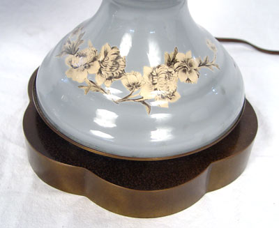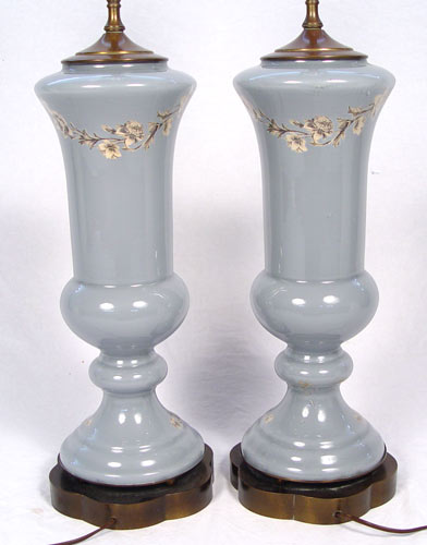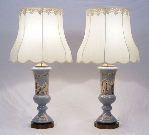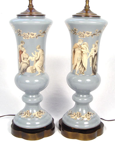 PAIR DECORATIVE REVERSE IMAGE LAMPS: Glass is 20'' high, lamps are 26'' high. Custom shades