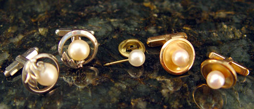 2 PAIR CUFFLINKS 14K GOLD & STERLING WITH CULTURED PEARLS: 1) 14K yellow gold disc shaped cufflinks with two 6.50-7.00 mm cultured pearls. 10.6 grams. Toggle closures. 10.6 grams. Sterling disc shaped cufflinks with two 8.50-9.00 mm cultured pearls. 10.6 grams. Toggle closures. Sold with faux pearl tie-tac.