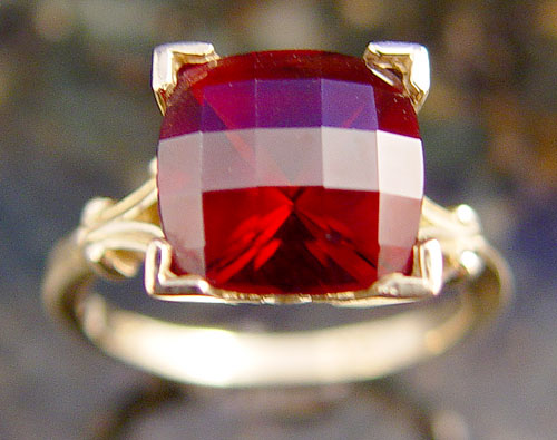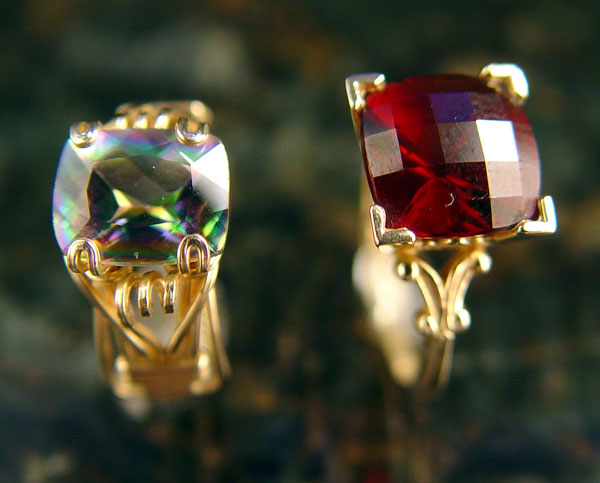 2 FASHION RINGS 3 CT MYSTIC TOPAZ & A 5 CT GARNET: 1) Cushion shaped mixed cut approx. 3.00 Ct. ''mystic topaz''. The topaz is prong set, unknown metal. Size 7 2) 14K yellow gold ring with one cushion shaped mixed cut approx. 5.00 Ct. garnet, rated VS in clarity (Type I), oR (brown modifier) in Hue, 7 in Tone and 2-3 in Saturation. The garnet is prong set. Weight: 4.4 grams. Size 7 1/2''.