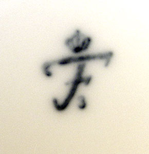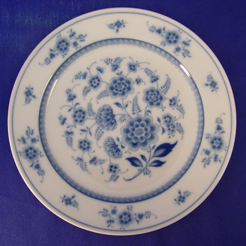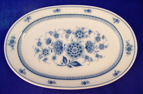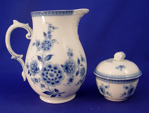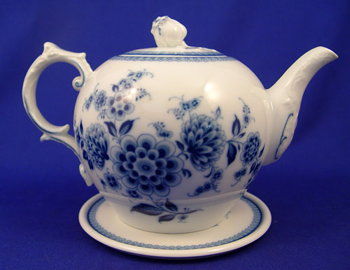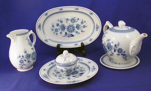 DELICATE 6 PIECE LOT OF FURSTENBERG CHINA: Blue and white china with floral decor to include, 6'' high teapot, water pitcher, trivet, covered jar, dessert plate and oval tray.