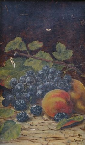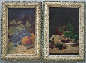 TWO 19TH C STILL LIFE PAINTINGS OF FRUIT: Raspberries and a Roemmer, Oil/Canvas, 13 3/4'' x 8 3/4'', signed Eva Whitney, dated November 12 1886, encased in over painted period gilt frame with wear, 17'' x 12''. Several punctures with minor abrasion. And a Still Life of Grapes, Black Raspberries, a Peach and a Pear, Oil/Canvas, 13 1/2'' x 8 1/2'', signed Mush, dated 1894, encased in over painted period frame with wear, 17'' x 12''. Several punctures and scattered abrasions with paint fleck in the grapes. Two paintings sold as a lot.