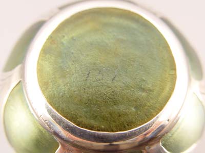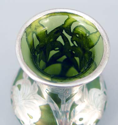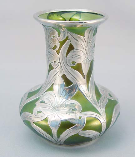 STERLING OVERLAY IRIDESCENT ART GLASS VASE: Green opalescent glass with 999 fine silver overlay, Alvin hallmark. 3 1/2'' h.