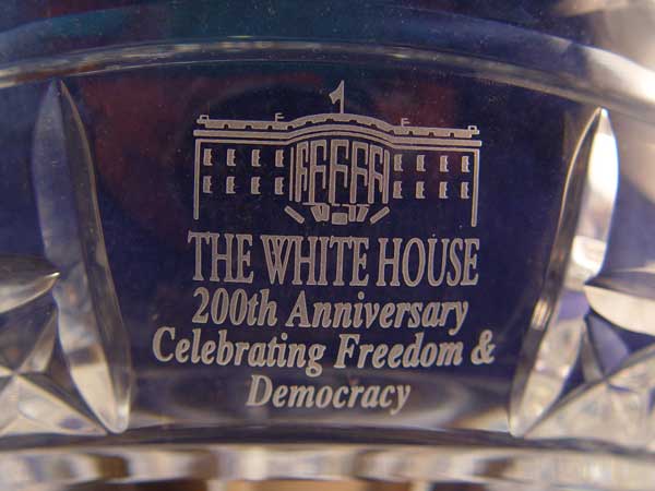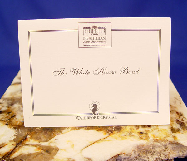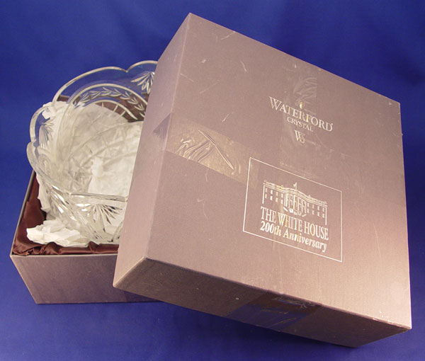 LARGE WATERFORD CRYSTAL WHITE HOUSE ANNIVERSARY BOWL: Limited edition #708 of 1000 large crystal bowl celebrating the 200th anniversary of the White House. Measures 7 5/8'' high x 10 5/8'' diameter. Sold with original box and paperwork.