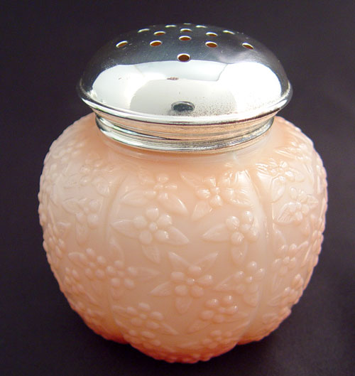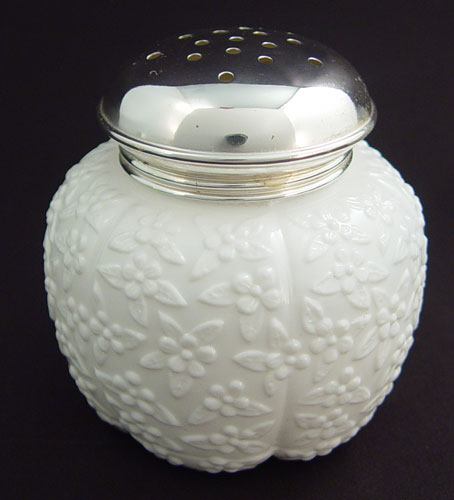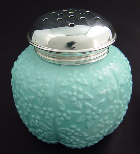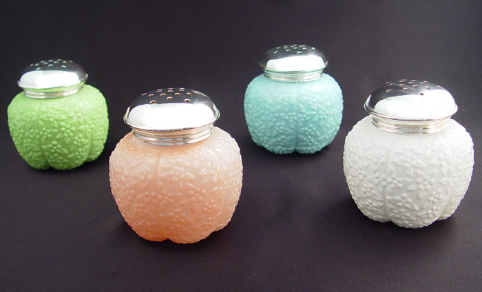 FOUR CHALLINOR MUFFINEERS IN THE FORGET ME NOT PATTERN: One of each color, blue, pink, white and green. Ribbed body, screw on silverplate tops. Please note roughness along edges under the caps. 3 3/4'' high.