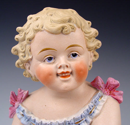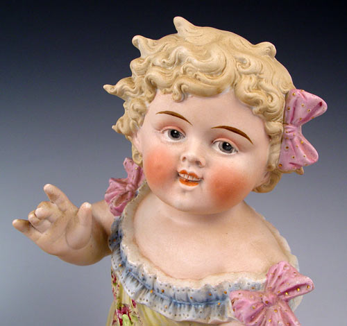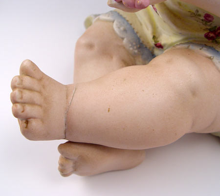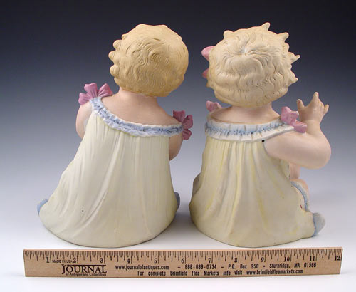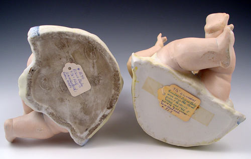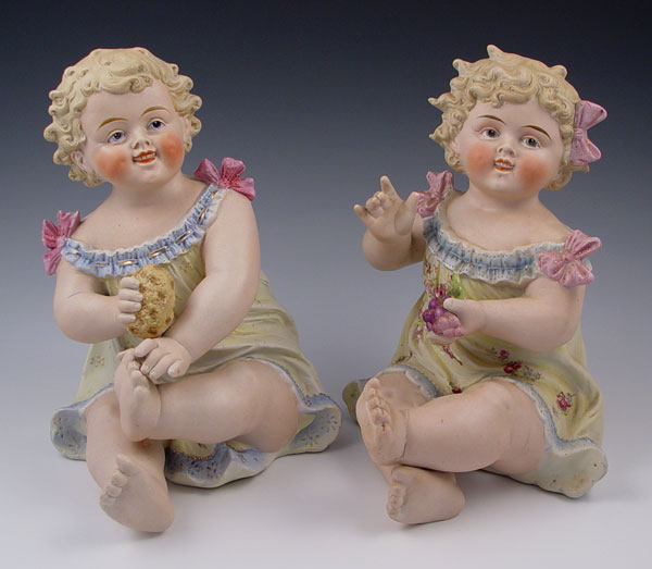 2 LARGE BISQUE PIANO BABIES: 1) 9 1/2'' tall unmarked holding potato. 2) 9 1/2'' unmarked Heubach, Note repair on left foot.