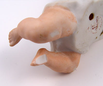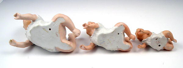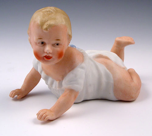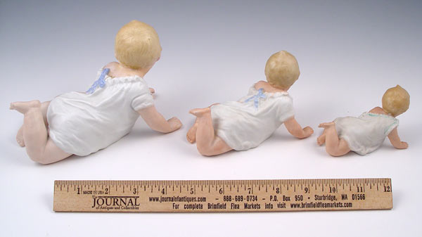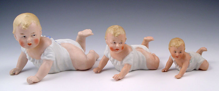 3 HEUBACH BISQUE CRAWLING PIANO BABIES: Crawling position, in graduating sizes 3'' - 7''. The 3'' long baby is marked Heubach.