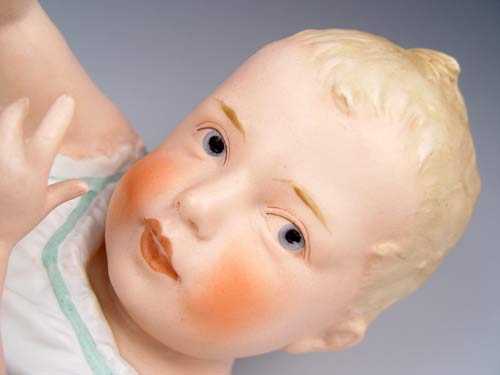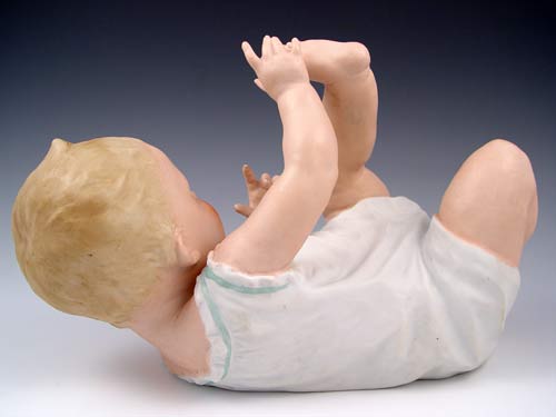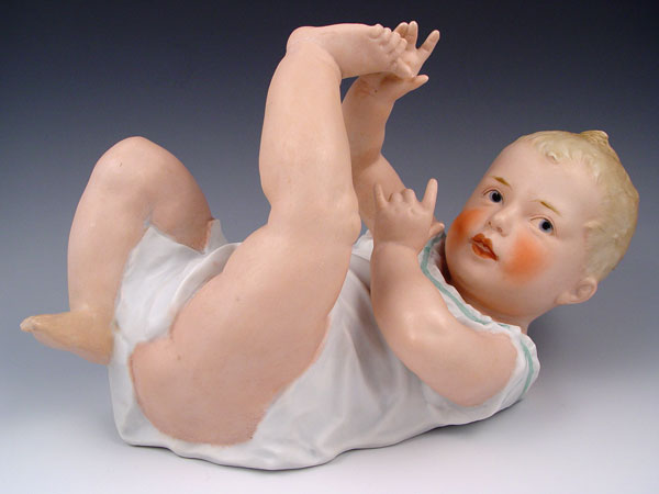 SIGNED HEUBACH GERMAN BISQUE PIANO BABY: Playing with her toes, 7 1/2'' tall x 13'' long.