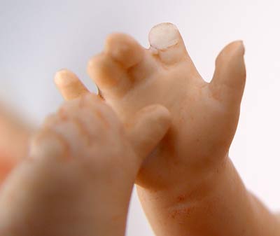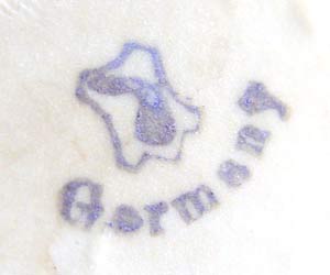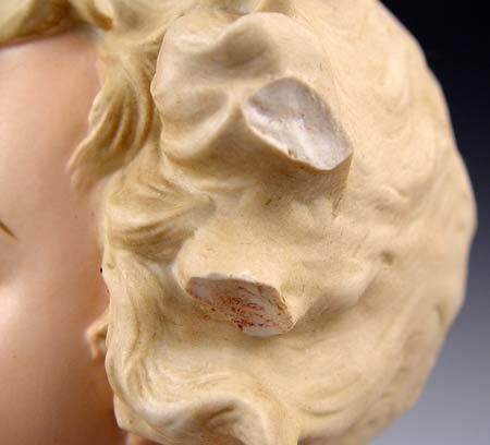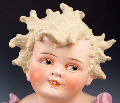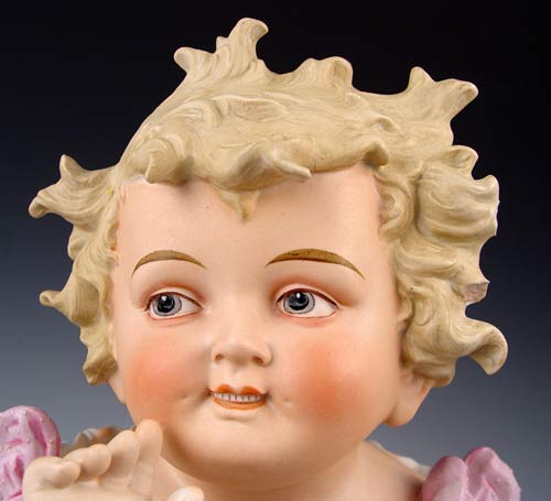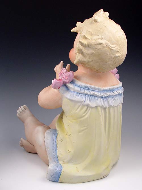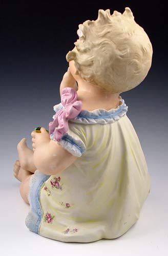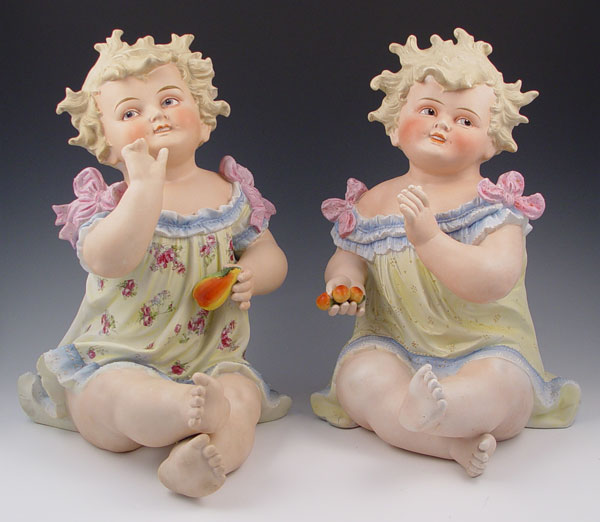 TWO 14'' LARGE BISQUE PIANO BABIES: 1) 14'' tall x 10 1/2'' long, Marked Germany. Hand to face holding pear. Please note chip on pear, 2 chips on hair. 2) 14'' tall x 11'' long, unmarked, holding cherries. Note chip on left index finger.