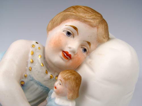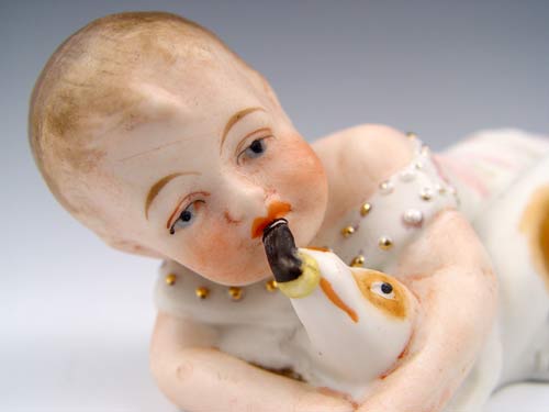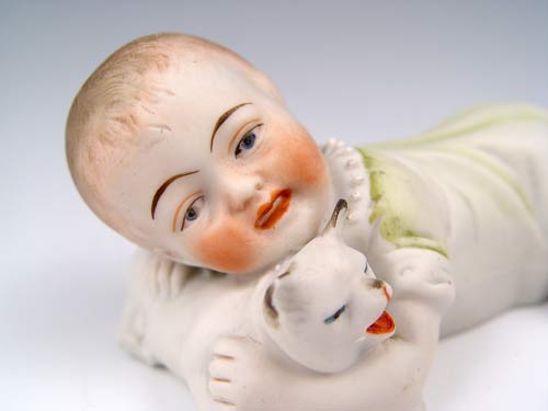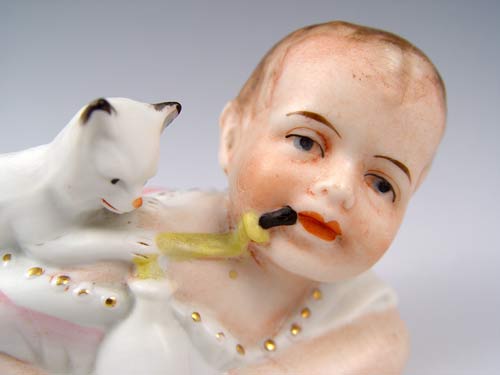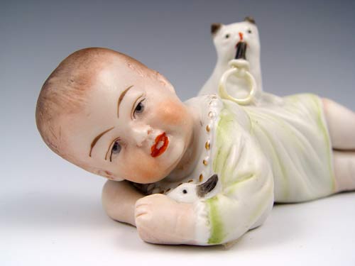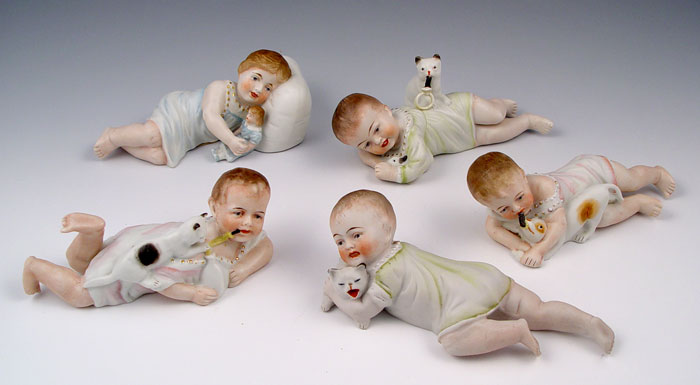GROUP OF 5 PIANO BABIES: Each playing with a kitten, puppy, or doll. 7'' long.
