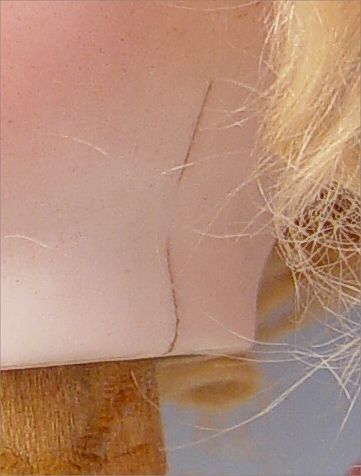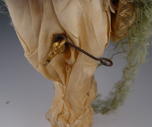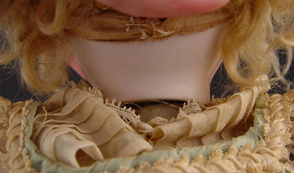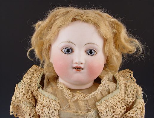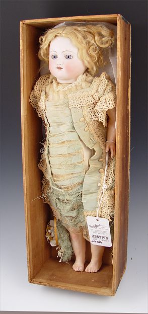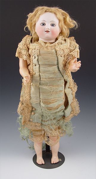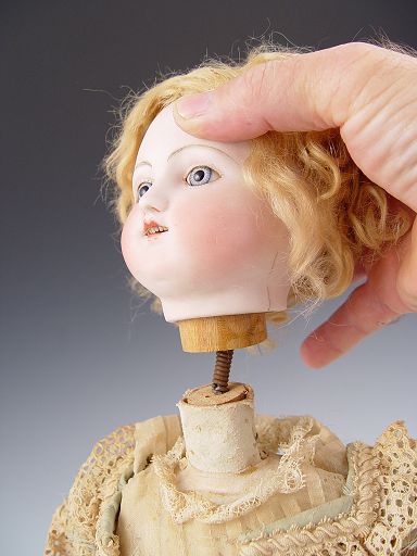 20'' ANTIQUE STEINER BISQUE HEAD AUTOMATON DOLL: Key wind doll, bisque head, composition body. In frayed original dress. Key is overwound. Unsigned, with the characteristics of a Steiner. Please note 1'' firing crack up the side of her head.