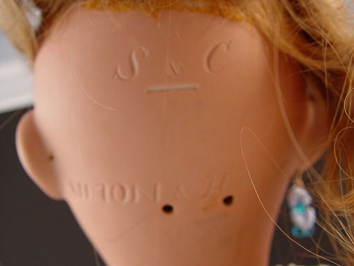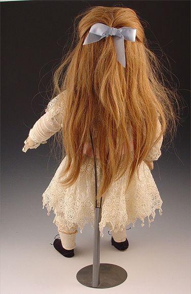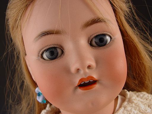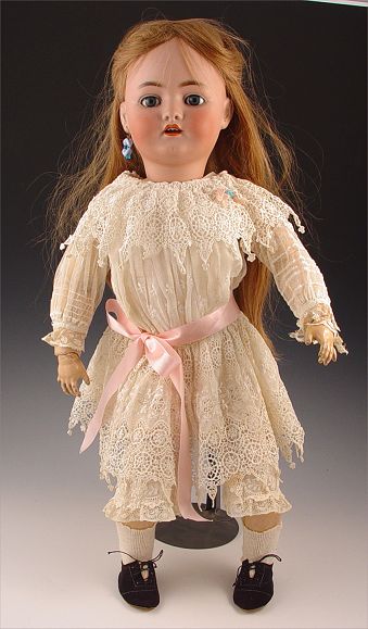 25'' S & C SIMON & HALBIG BISQUE HEAD DOLL: Open blue glass eyes, open mouth with 3 teeth, long blonde wig. Composition body. Marked on back of neck ''S & C Simon & Halbig 60''. White lace dress & knickers. Missing right pinkie finger.
