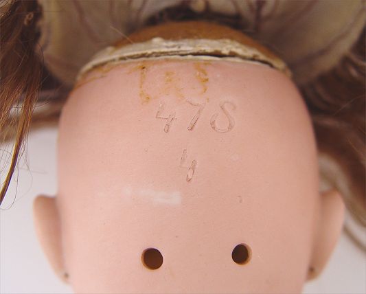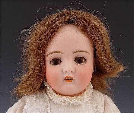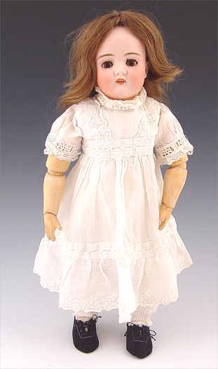 16'' SIMON & HALBIG BISQUE HEAD DOLL: Sleepy brown eyes, pierced ears, open mouth with 4 teeth, dimple chin, brown wig. Composition body with jointed arms & legs. White cotton dress.