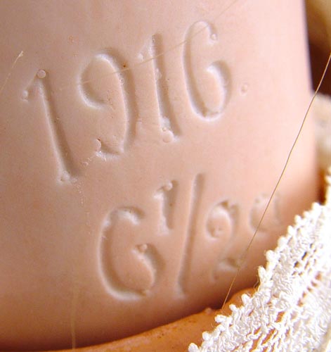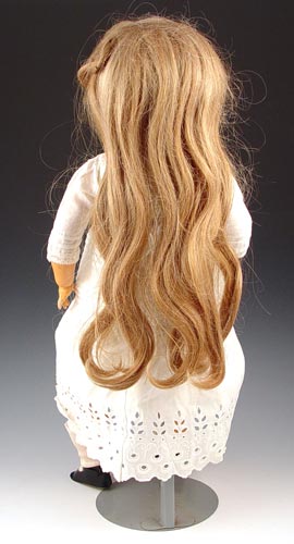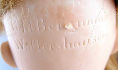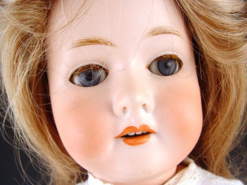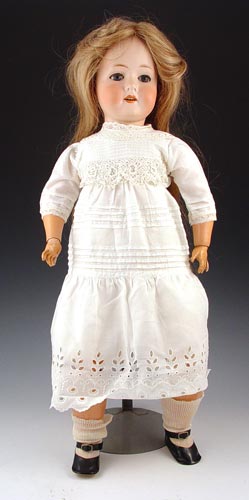 23'' C.M. BERGMANN BISQUE HEAD DOLL: C. M. Bergmann operated a doll company in Waltershausen, Germany from 1888 till they went bankrupt in 1931. This doll has Sleepy blue eyes, open mouth with 4 teeth. Long blonde wig. Jointed arms, hands & legs. White eyelet dress, black patent shoes. Please note damage to eyelashes.