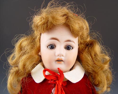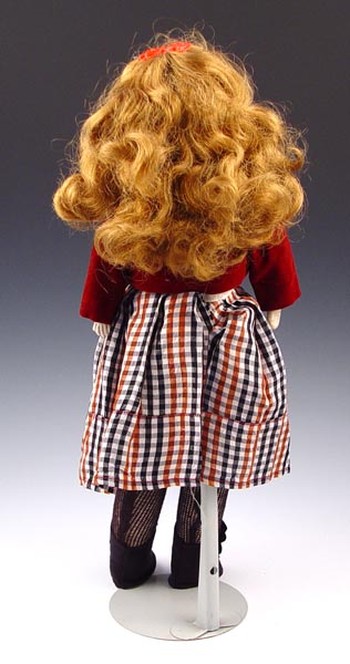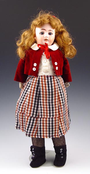 15'' HEINRICH HANDWERCK GERMAN BISQUE HEAD DOLL: Open blue eyes, open mouth with 4 teeth. Light brown long curly wig. Leather body, bisque hands. Burgundy velvet hat & jacket, black felt boots, checkered school girl skirt with slip.