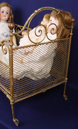 VICTORIAN CURLY Q IRON DOLL BED: 20 1/2'' tall, 26'' long.