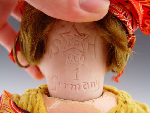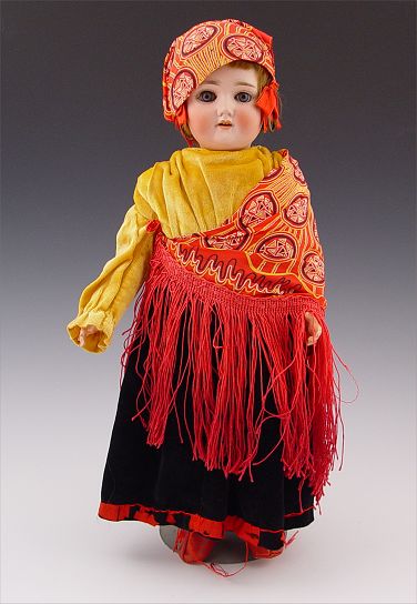 18'' SCHOENEAU & HOFFMEISTER BISQUE HEAD GYPSY DOLL: Head marked ''SH 1909 1 Germany'' with PB in a star. Open eyes, open mouth with 2 teeth. Fully jointed composition body. Original clothes for this rare gypsy.
