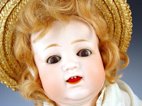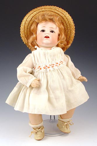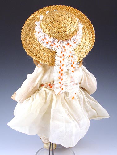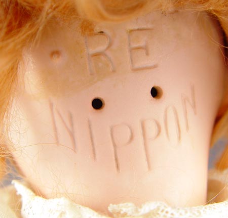 14'' NIPPON A5 MK RE BISQUE HEAD DOLL: Marked ''RE NIPPON'', Sleepy brown glass eyes, molded closed mouth 2 teeth. Composition body. Original hat. No eyelashes. Jackie Barkers grandmother's doll.