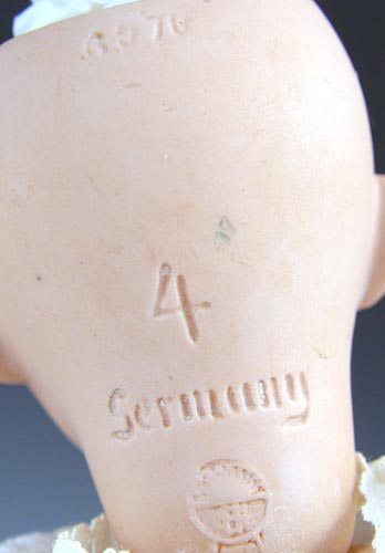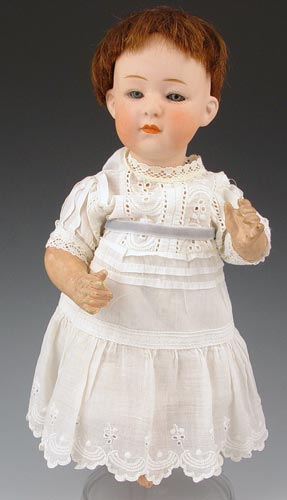 12'' HEUBACH GERMAN BISQUE HEAD DOLL: Marked 4 Germany. Open eyes, composition body with white cotton dress. Note damage to right fingers and left toes, wig has been cut.