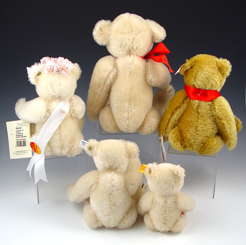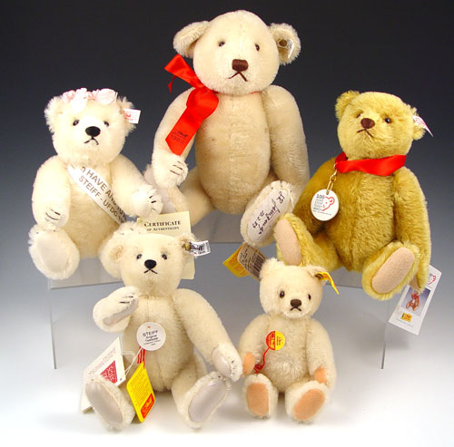 5 CONTEMPORARY STEIFF LIMITED EDITIONS BEARS: 1) Bridal Bear 1997, 10'' 2) A 1989 big bear, autographed, s13'' 3) Gerburstags Bear, 11''. 4) Margaret Woodbury Strong Museum bear, 9 1/2''. 5) Baby bear, 7''.