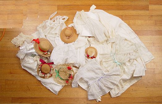 ESTATE COLLECTION OF VICTORIAN WHITE DOLL DRESSES: Includes straw hats and extra lace yardage.