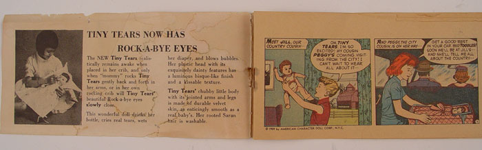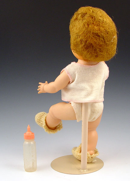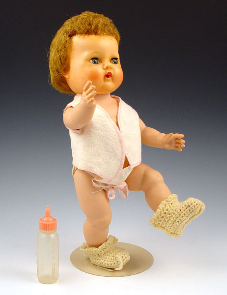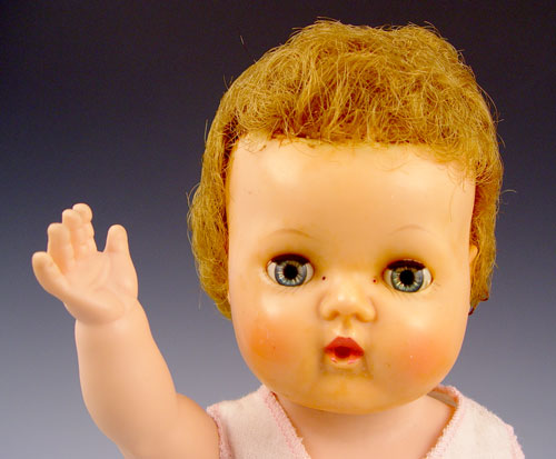 VINTAGE TINY TEARS AMERICAN CHARACTER DOLL 12'': Original fine condition with sleepy eyes. Full head of hair. Original pink swaddling clothes. Drinks from bottle cries real tears, wets diaper, blows bubbles.