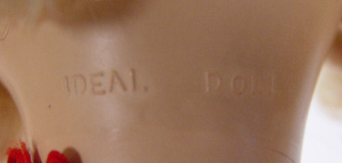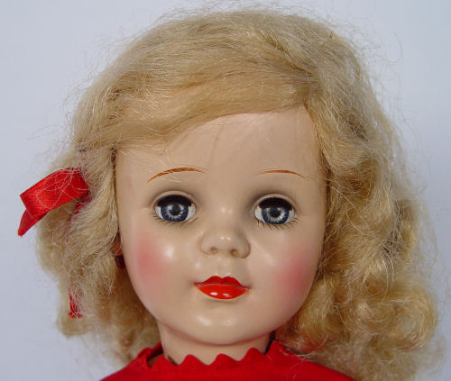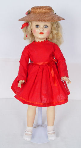 24'' IDEAL DOLL 1950 HARD PLASTIC: Sleepy blue eyes, blonde hair. Red cotton dress with straw hat.