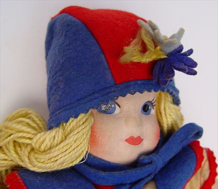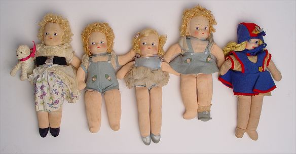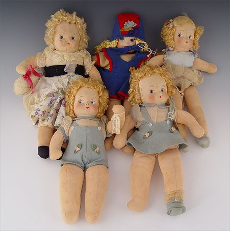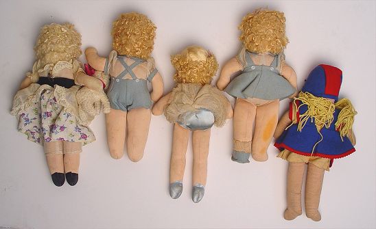 FIVE VINTAGE RAG DOLLS: 1) 13'', 1945, yellow string hair, felt blue dress trimmed in red. 2) 14'' Little Bo Beep with lamb, 1946, saran wig, original clothes. 3) 12 1/2'' Jack, original blue felt suit, saran wig, painted face, eyes cut to side. 4) 12 1/2'' Jill, 1946, painted face and eyes, blue felt dress and shoes, saran blonde curly wig, eyes cut to side. 5) 14'' Dale Ballerina, satin top and shoes, blue net skirt, 1946 saran wig, nylon type body, painted face and eyes cut to side.