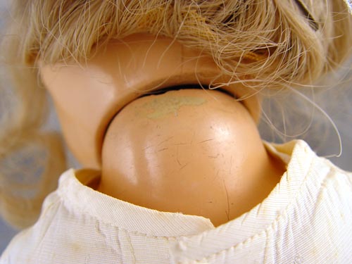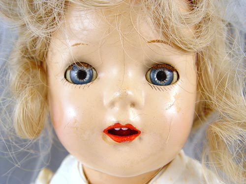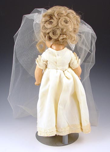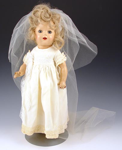 15'' MADAME ALEXANDER BRIDE DOLL FOR SEARS 1940: Claimed to be made for Sears by Madame Alexander. Composition, sleepy blue eyes, open mouth with 4 teeth. Original dress & pants, new wig on head. Note damage on both hands. This was Jackie Barker's Childhood doll.
