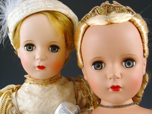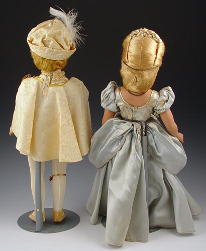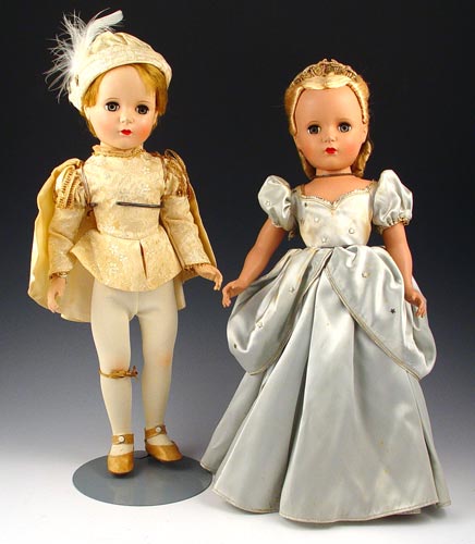 PAIR MADAME ALEXANDER PRINCE CHARMING / CINDERELLA DOLLS: Hard plastic all original dolls and costumes, Ca. 1950's. 18''h. First Place Winners Florida Space Coast Doll Club 1991. Cinderella has foxing on gown.