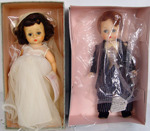 MADAME ALEXANDER BRIDE AND GROOM DOLLS: Wendy Kins Bride and Bent Knee Walker Groom dolls, both 8'' tall.