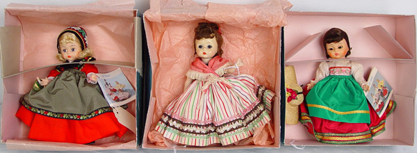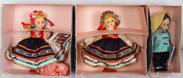 LOT OF 6 MADAME ALEXANDER INTERNATIONAL DOLLS: 1) 8'' Swedish MIB; 2) 8'' Italian 3) 8'' Polish bent knee 1970 MIB; 4) 8'' Polish MIB; 5) 8'' Wendy does the Mambo 1955; 6) 8'' China 1973
