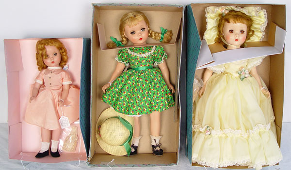 LOT OF 3 MADAME ALEXANDER HARD PLASTIC DOLLS: 1) 18'' Maggie Walker, copy dress; 2) 18'' Polly Pigtails 1949-1951, copy dress, box broken; 3) 14'' Maggie Face, original dress, no pants, copy shoes.