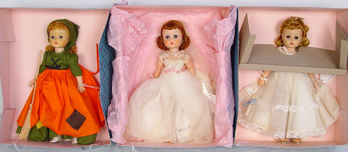 LOT OF 3 MADAME ALEXANDER LISSY DOLLS: To include 1) 11 1/2'' Lissy Bride 1957 autographed by Madame Alexander 12-16-78, all original; 2) Rare Lissy Graduate, all original, 11 1/2''; 3) 12'' Lissy Poor Cinderella, made in 1966 only. Lissy is the very doll in Marjorie Uhl's Book ''Madame Alexander Dolls on Review'', 1981. Page 72