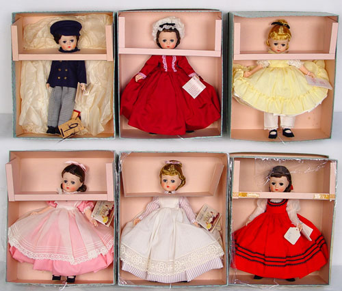 MADAME ALEXANDER LITTLE WOMEN SERIES DOLLS: Jo, Meg, Laurie, Mamie, Amy and Beth. All 12'' tall and in boxes.