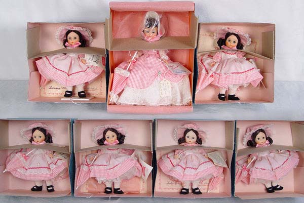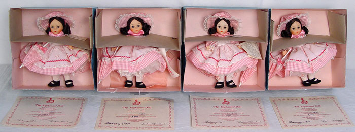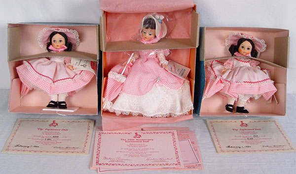 7 MADAME ALEXANDER ''ENCHANTED DOLL'' LIMITED EDITIONS: Made exclusively for The Enchanted Doll House, in Manchester Vermont, by Madame Alexander. Includes four 1980 dolls, two 1981 dolls. All 8''. Also included is a Special Edition Enchanted Doll 1988, 10''.