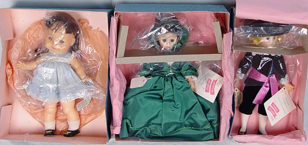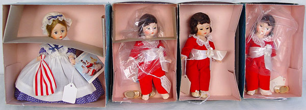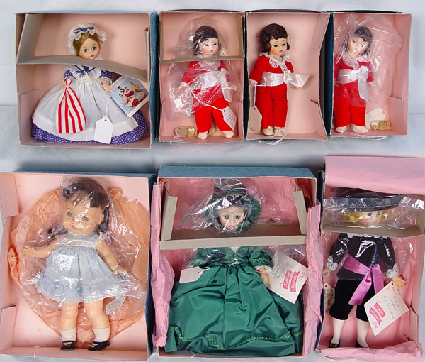 LOT OF 7 MADAME ALEXANDER DOLLS: Includes 3 Red Boy 8''; Lord Fauntleroy MIB 14''; Betsy Ross 8'' MIB; Scarlet 12'' (first year made in 1981; Janie 12'' hard plastic 1964. Janie is the very doll in Marjorie Uhl's Book ''Madame Alexander Dolls on Review'', 1981. Page 130