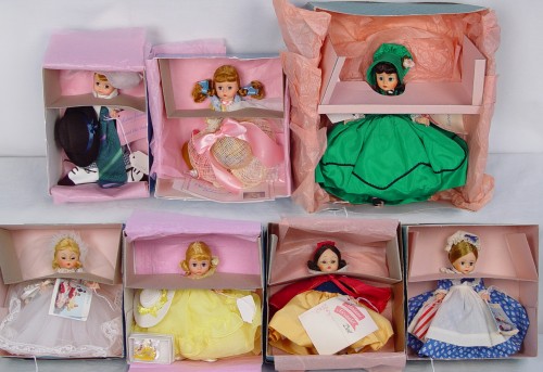 LOT OF 7 MADAME ALEXANDER DOLLS: Includes Dressed Like Daddy 8'' MIB; Dressed Like Mommy 8'' MIB 96 collection; Miss Leigh 8'' 1989 MIB; Snow White 8'' 1972 MIB (bent knee) Disney only; Scarlet ''Portraits'' MIB 12''; Betsy Ross 8'' (hair in bun) MIB; Bride Doll 8'' MIB.