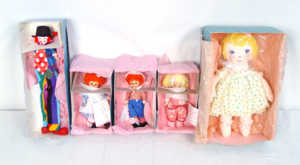LOT OF 4 MADAME ALEXANDER DOLLS: 1) 8'' ''Stilts'', clown on stilts 14''; 2) 7 1/2'' Funny Maggie Storyland doll, blonde yarn hair; 3) 7 1/2'' Mop Top Wendy Storyland Doll, red yarn hair; 4) 14'' Muffin cloth doll, Retired in 1975 or 76. MIB.