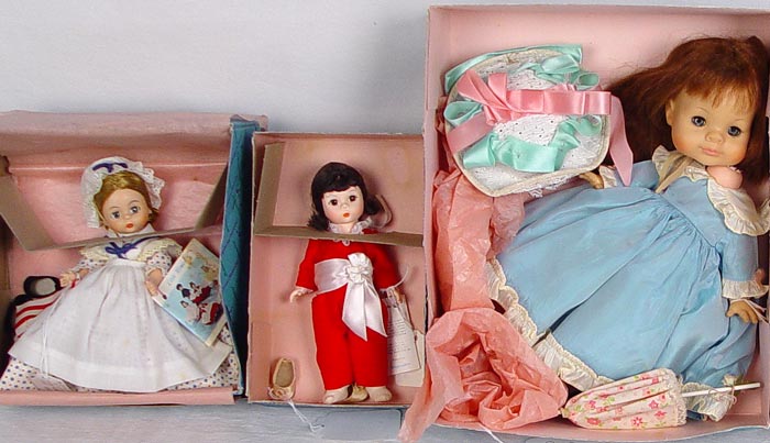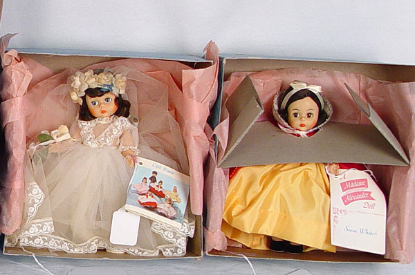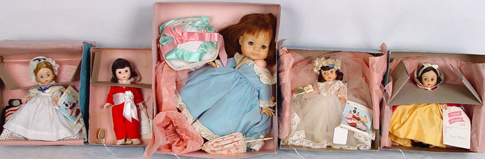 LOT OF 5 MADAME ALEXANDER DOLLS: Includes Red Boy MIB 8''; Bride MIB 1975 8''; Snow White 8''; Betsy Ross hard plastic 1975 8''; Lucinda (head unstrung) 12''. All in boxes.