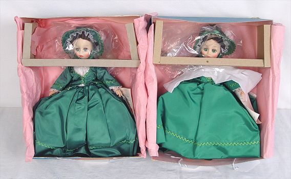 2 MADAME ALEXANDER SCARLET DOLLS: Green satin dress, 1st made in 1981. Both 12'' tall.