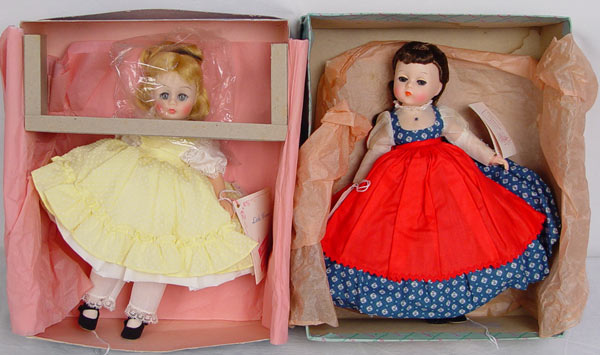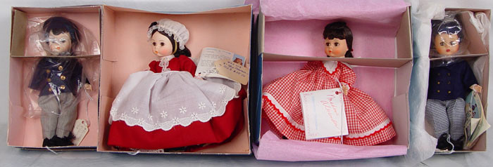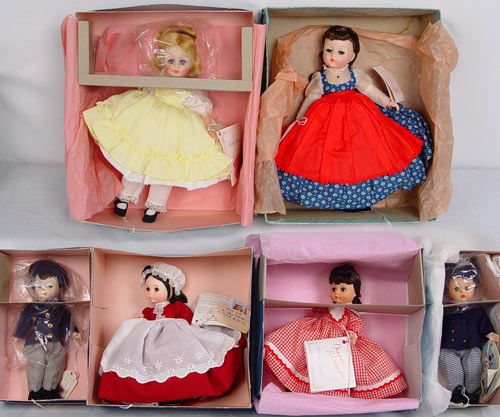 LOT OF 6 MADAME ALEXANDER LITTLE WOMEN DOLLS: Includes Laurie 8'' (bent knee) all original; Laurie 8''; Marme 8''; Jo 8''; Amy 12'' Jo 12'' HP; Lissy. All MIB.