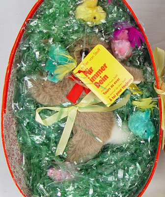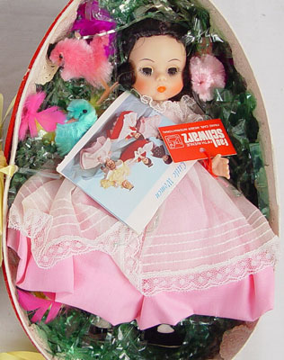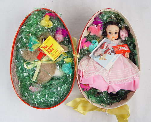 FAO SCHWARTZ EASTER EGG WITH STEIFF RABBIT & MADAME ALEXANDER BETH DOLL: In original box, made exclusively for FAO Schwartz. Doll 8'' tall, egg 9 1/2'' x 6 1/2'' x 7'' approx.